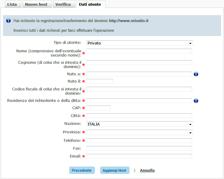 La richiesta di registrazione/trasferimento si completa con la compilazione della form sottostante.